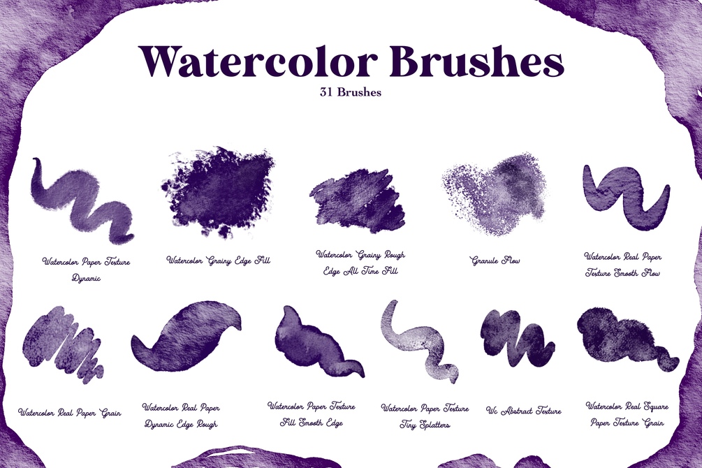 31 Brushes (realistic watercolour brushes, splatters, smudge and gold rush for sparkling effect) 7 Real Canvas paper texture (single procreate file, easy to check which texture suits best to your artwork at one place)