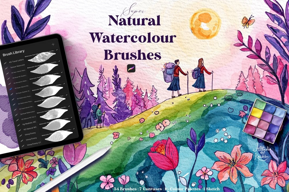 Experience the magic of Super Natural Watercolor Procreate Brushes – the most authentic watercolor simulation for digital artists! These brushes flow, blend, and bleed just like real watercolor on paper, capturing every delicate nuance of traditional painting.